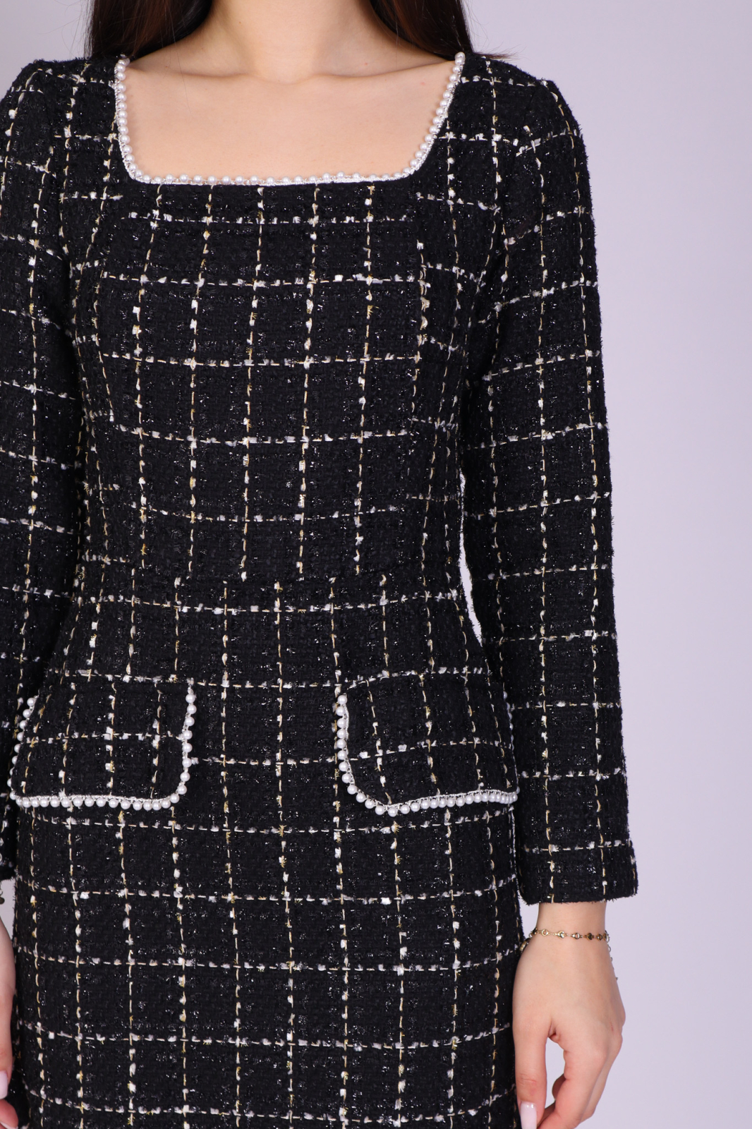 Rochia Bonnie este realizată din material texturat cu model clasic în carouri, având o croială cambrată ce evidențiază armonios silueta. Decolteul drept oferă un aer modern și feminin, iar buzunarele frontale decorative adaugă un plus de stil și funcționalitate. Designul mini, cu mâneci lungi și structură ușor rigidă, transformă această piesă într-o alegere ideală pentru ținute elegante de zi sau apariții smart-chic.