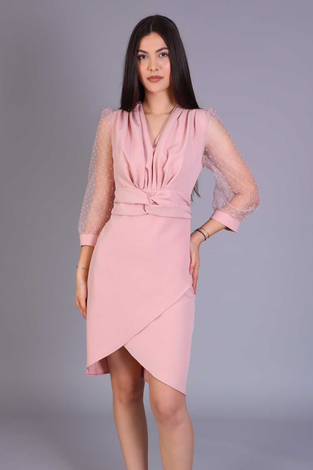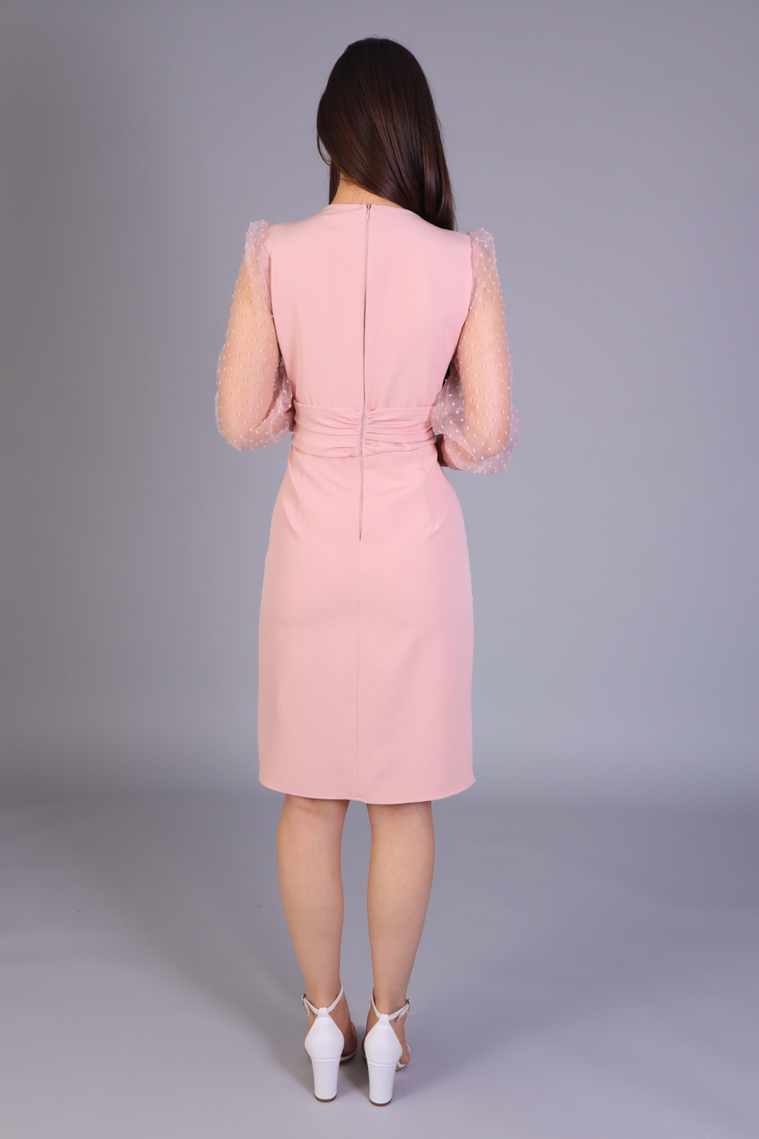 Rochie de ocazie din stofa, cu maneci delicate din dantela. Modelul are decolteu in V cu insertie de tulle transparent, maneci lungi si croiala conica, evidentiata de pliuri pe fusta. Compozitie: 90% Poliester, 10% Elastan.