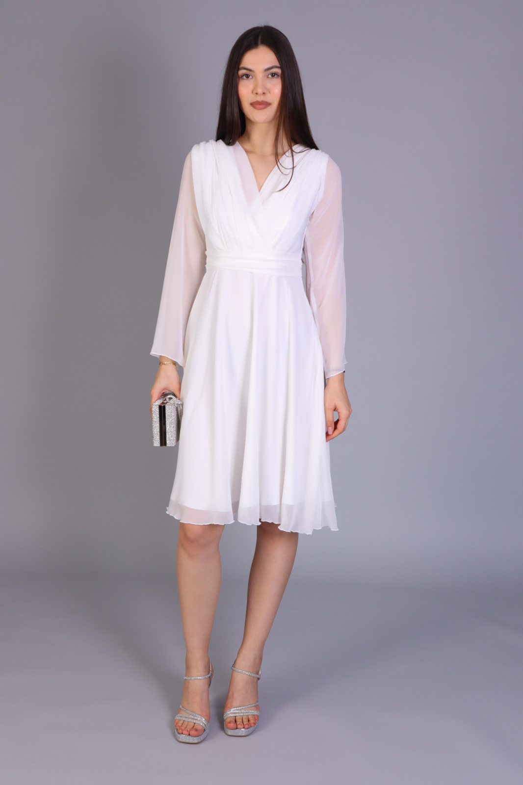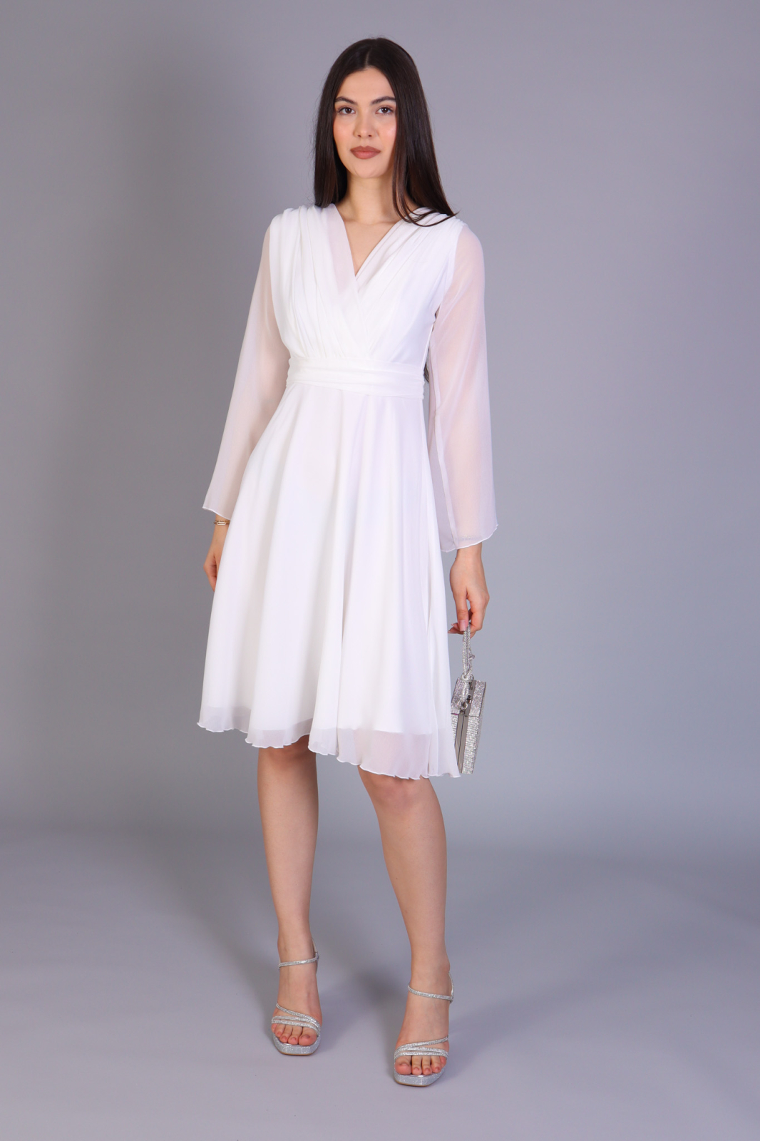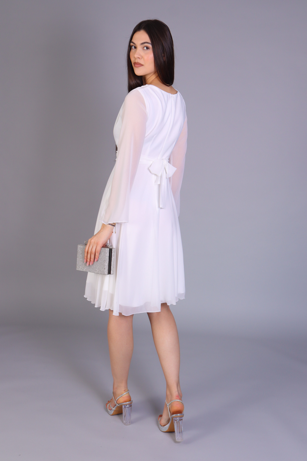 Rochia ALYA albă din voal, cu cordon detașabil, are un croi clos și lejer, care oferă fluiditate și confort la purtare. Bustul petrecut evidențiază delicat silueta, iar închiderea cu fermoar la spate asigură o fixare practică și discretă. Compozitie: 90% Poliester, 10% Elastan.