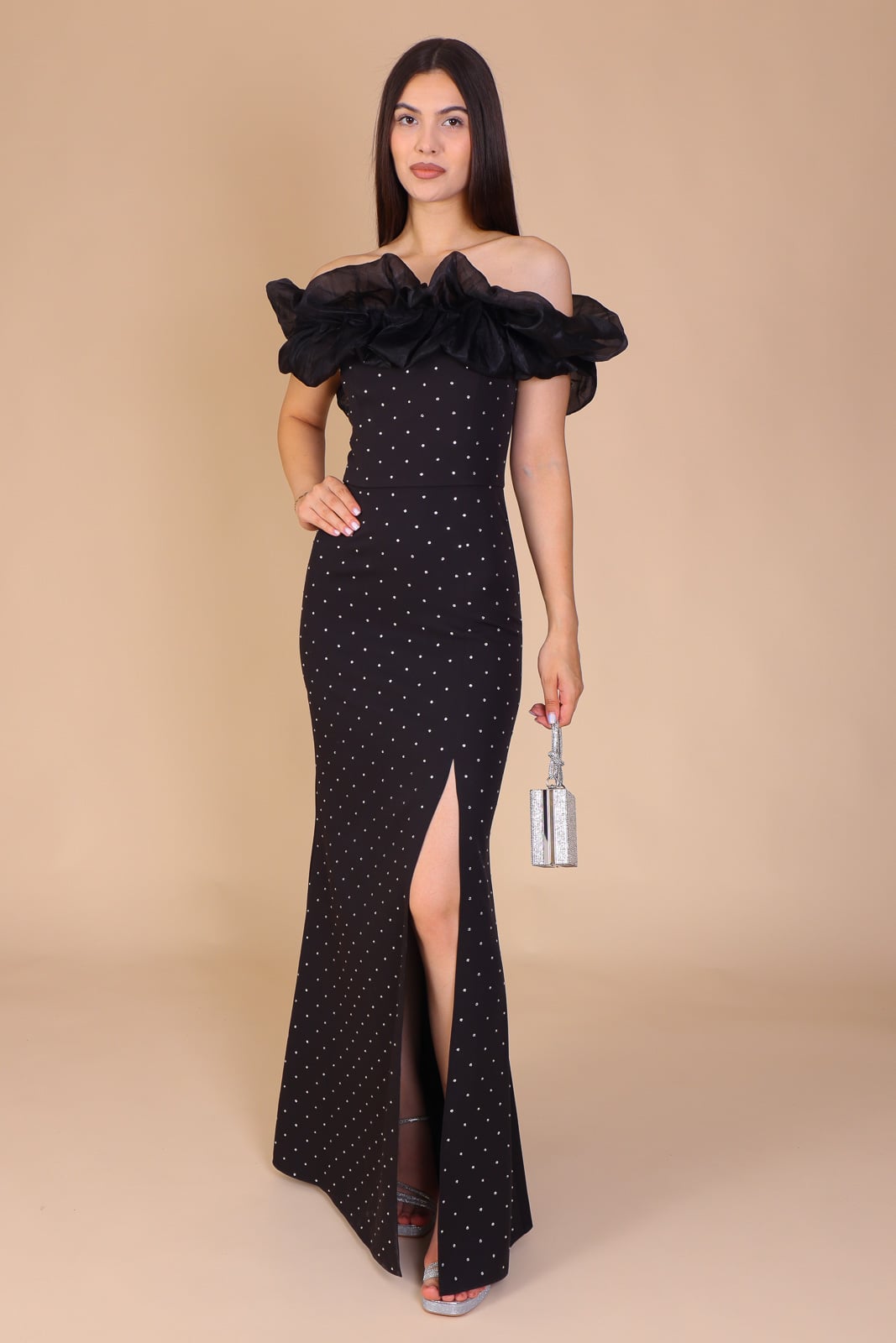 Rochie eleganta, lunga, realizata din stofa si accesorizata cu strasuri. Are guler din organza lasat pe umar, design mulat si crapatura laterala. Compozitie: 90% Poliester, 10% Elastan.