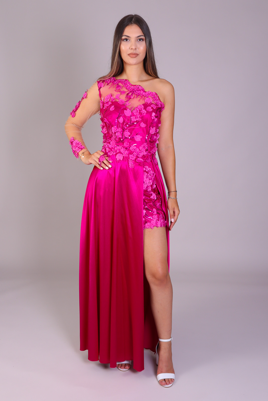 Rochie lungă de ocazie cu crepeu, bust din dantelă 3D, mânecă lungă din plasă și un umăr gol. Se închide cu fermoar la spate.