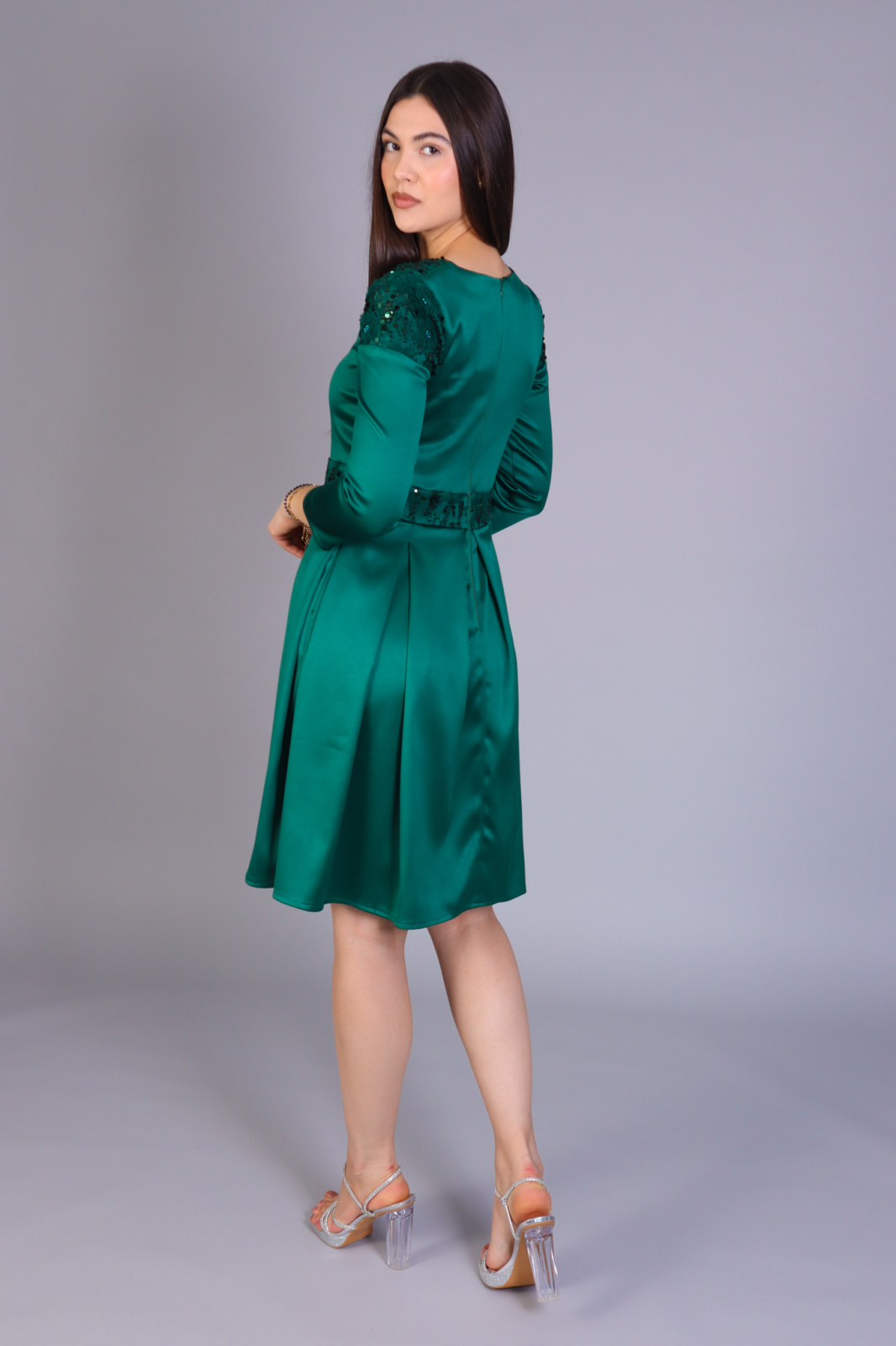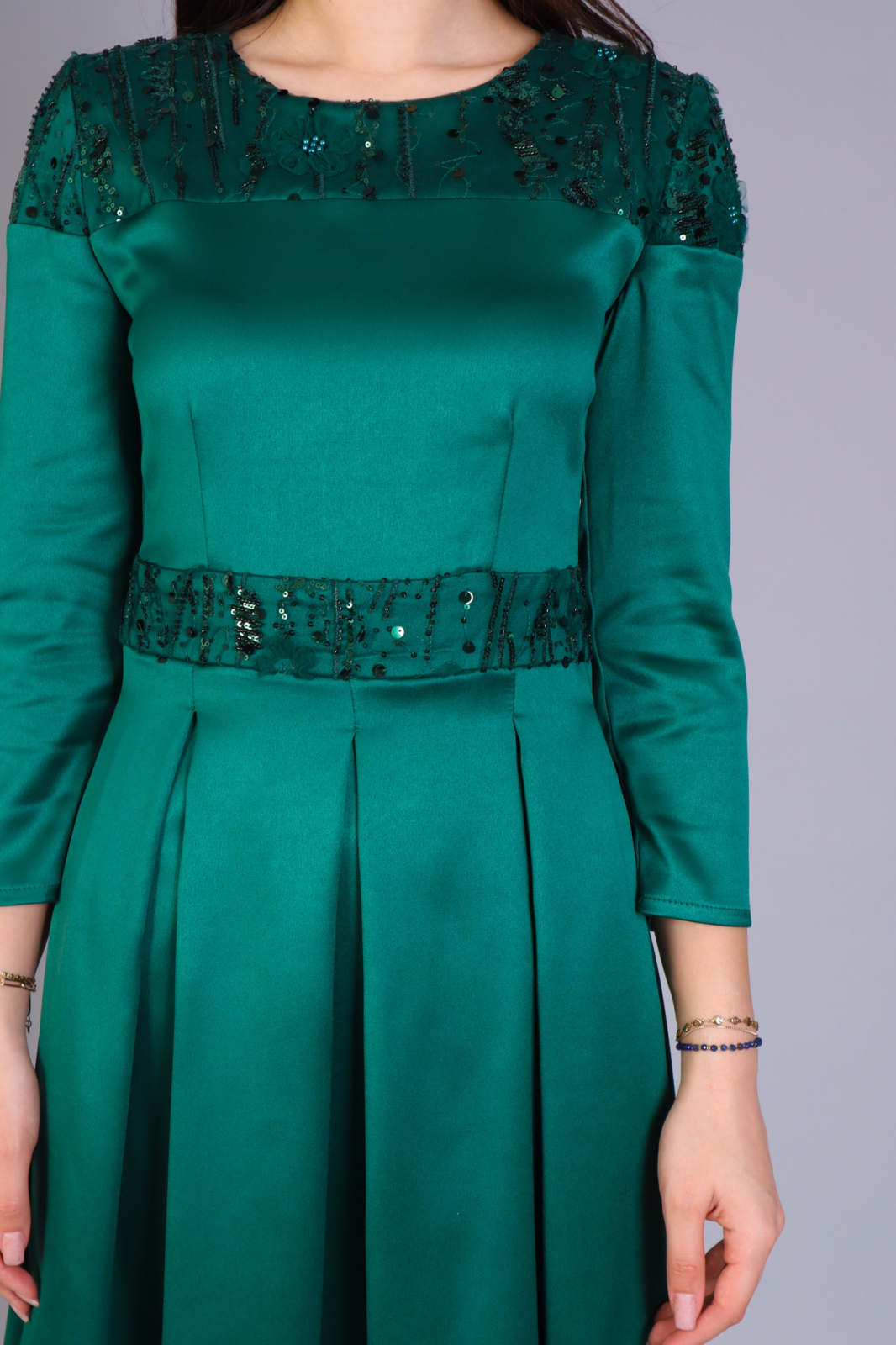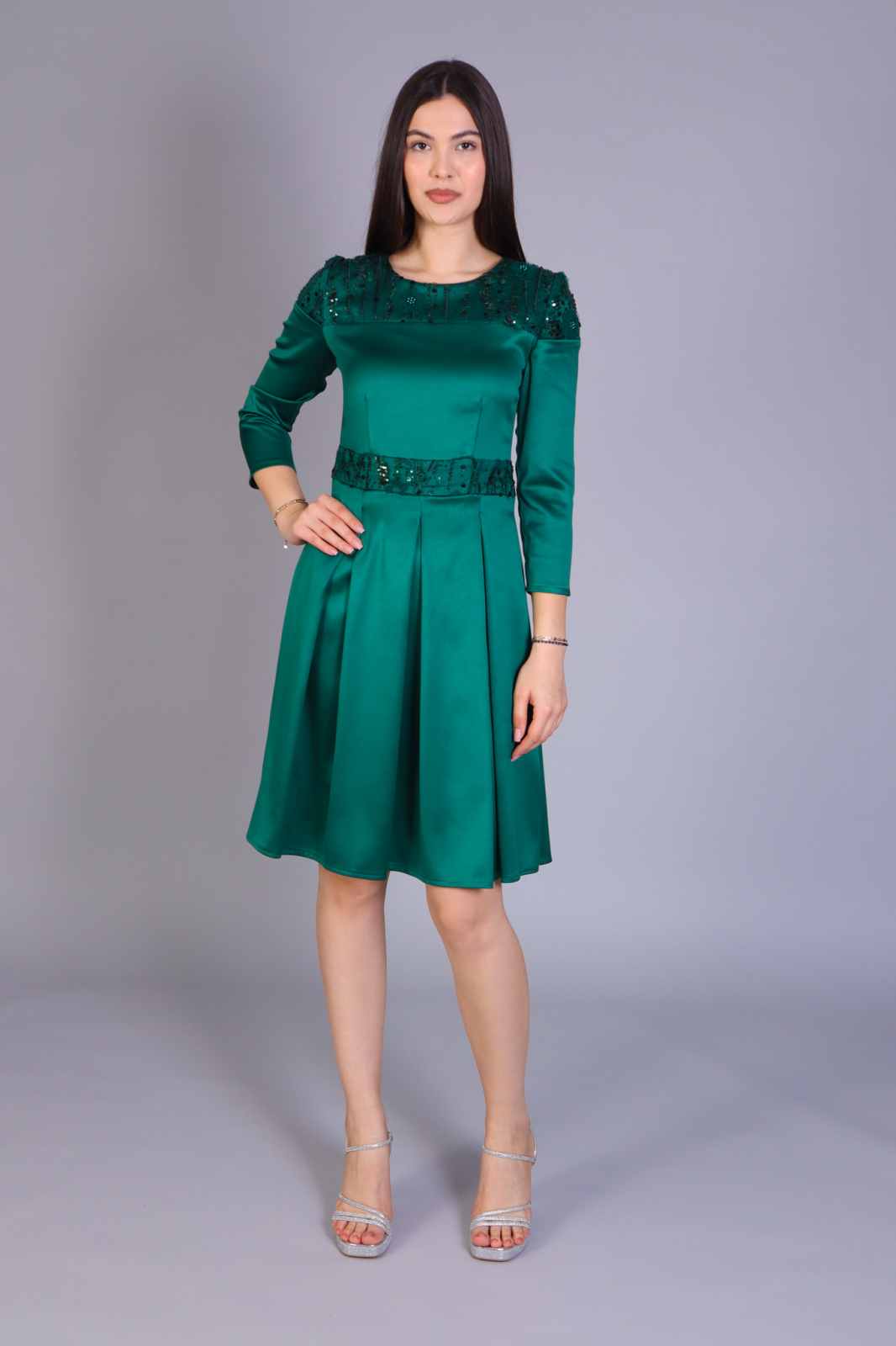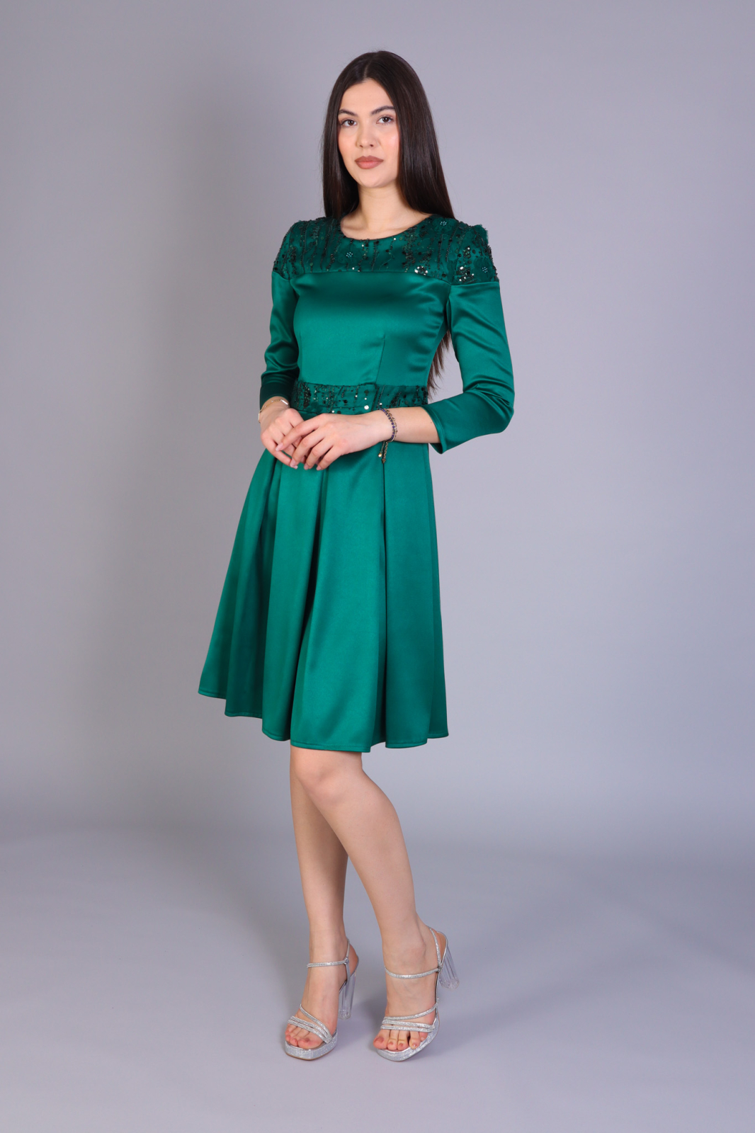 Rochie din tafta, cu dantelă aplicată pe bust și în talie. Fusta este amplă, realizată în pliuri elegante, iar mânecile trei sferturi completează designul feminin. Modelul se închide cu fermoar la spate și este căptușit pe interior pentru un plus de confort. Compozitie: 90% Poliester, 10% Elastan.