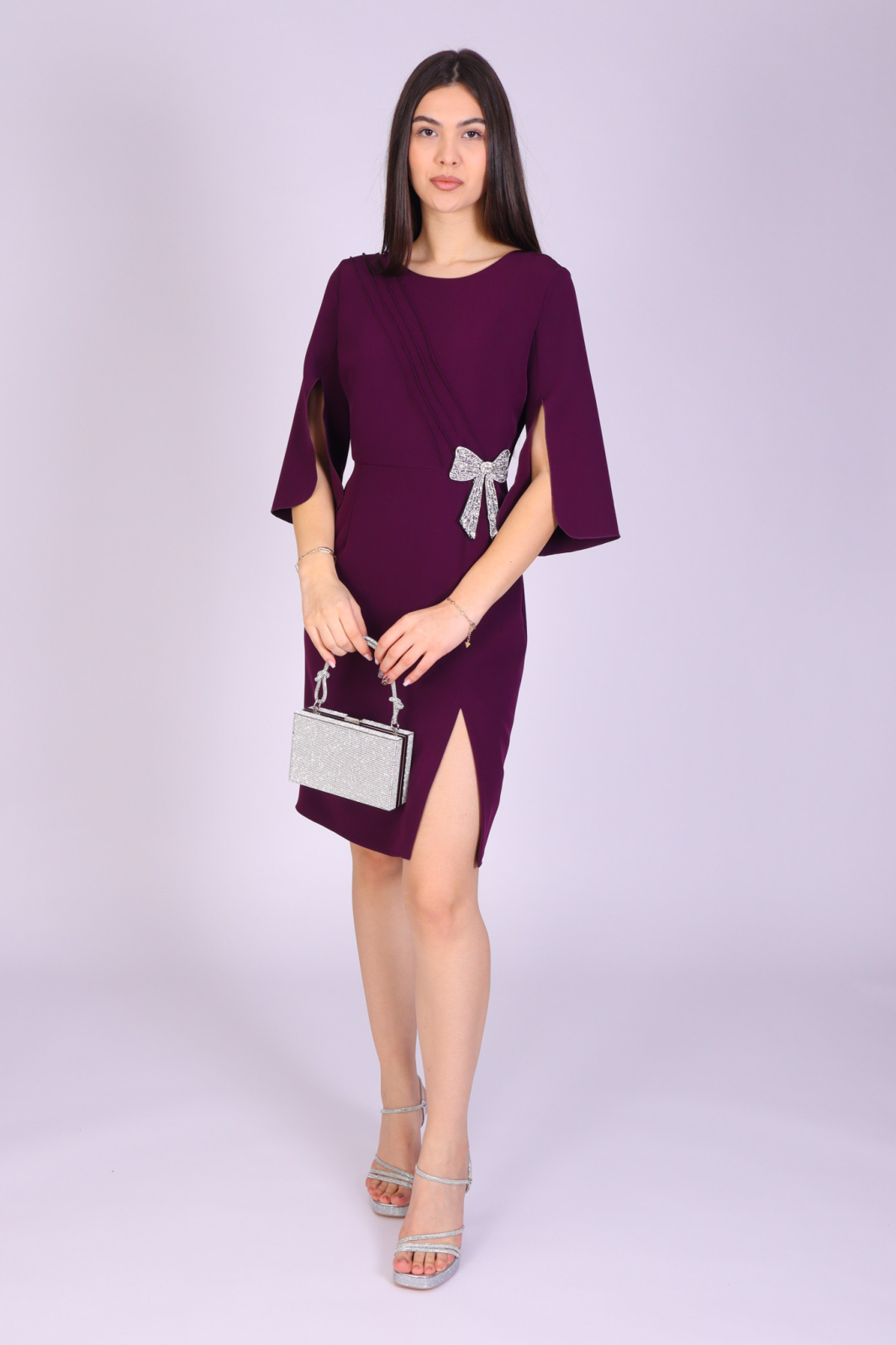 Rochie elegantă de ocazie din stofă, decorată cu broderie și paiete, cu decolteu rotund, mâneci trei sferturi cu decupaj și croială conică.