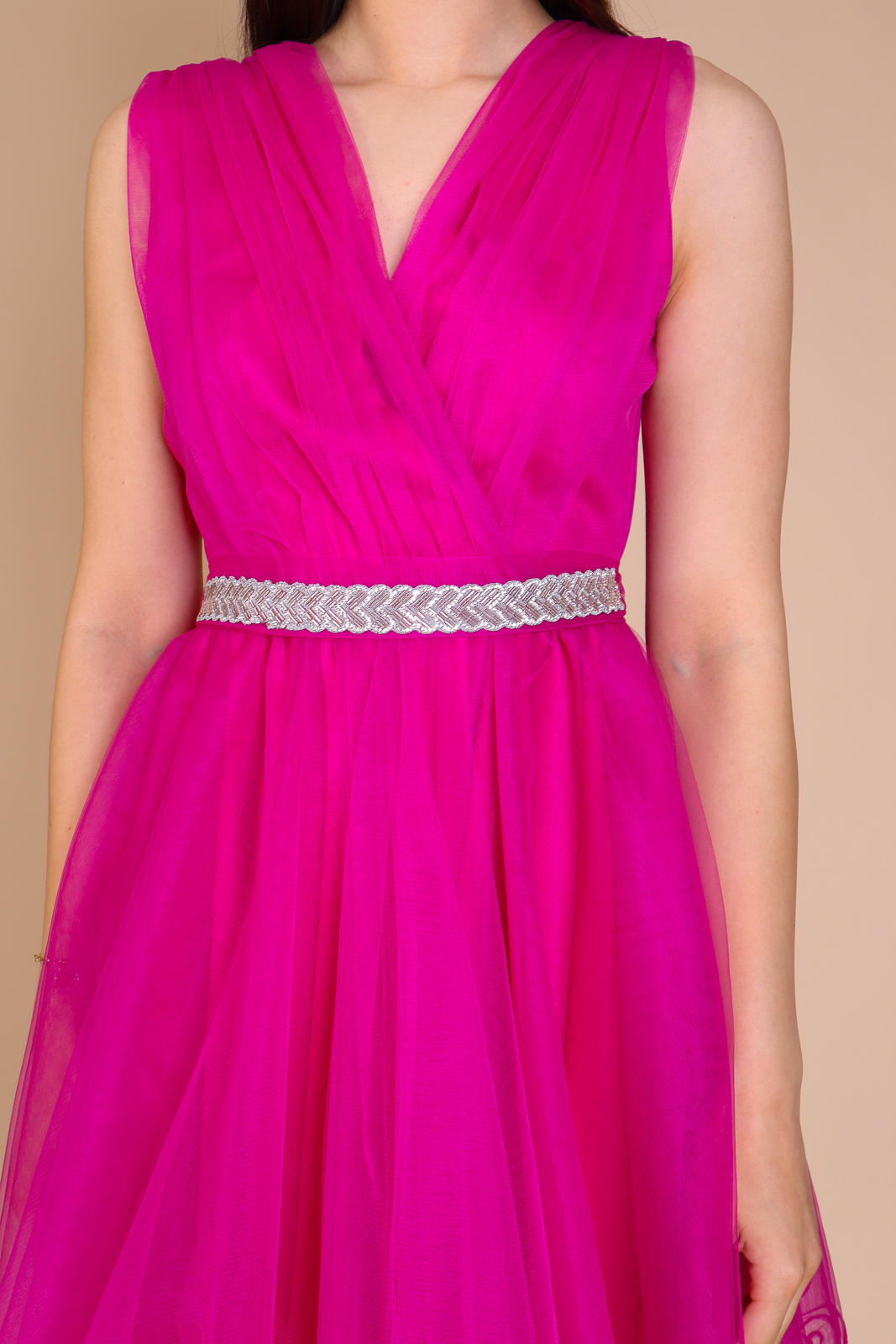 Rochie de ocazie din tulle cu bustul petrecut si pliuri. Aceasta are un cordon detasabil accesorizat cu pietricele. Inchidere cu fermoar la spate. Compozitie: 100% poliester