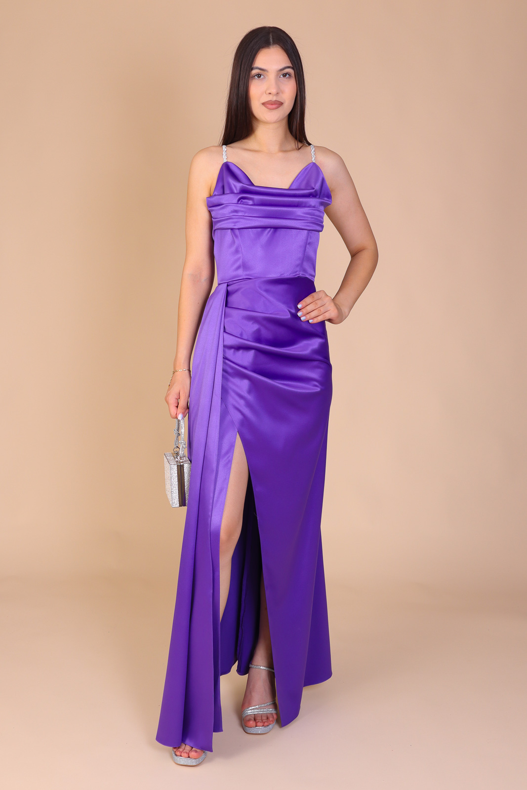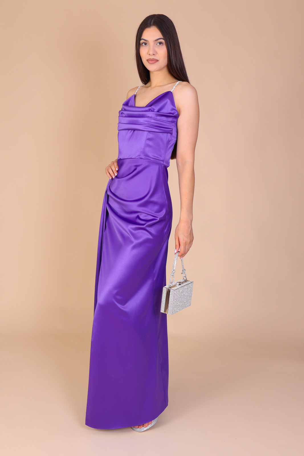 Rochie lungă, mulată pe siluetă, cu corset în colțuri întărit cu balene pentru o talie bine conturată. Bustul cu pliuri fine și trena elegantă creează un efect rafinat și regal, iar bretelele cu pietricele argintii adaugă strălucire. Disponibilă în serii de 6 bucăți, mărimi 34–44. Fabricată în România, producție proprie.