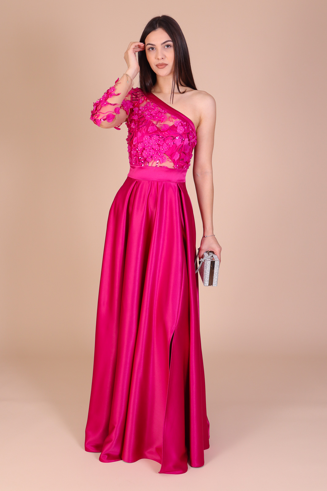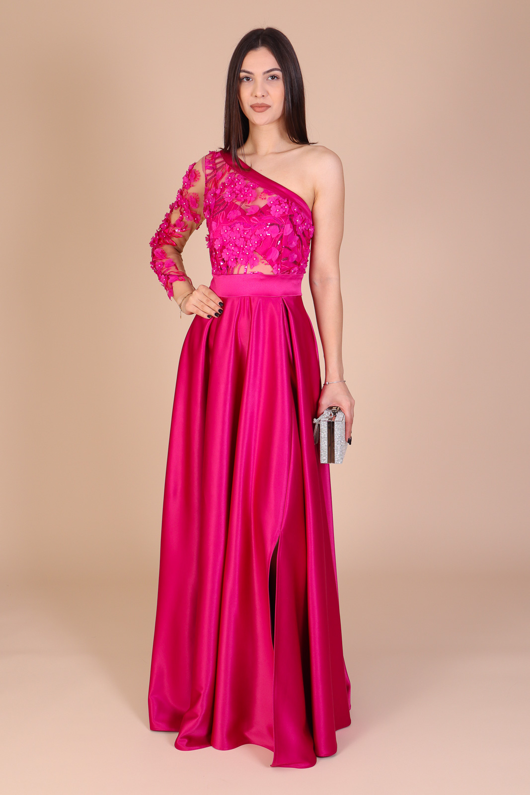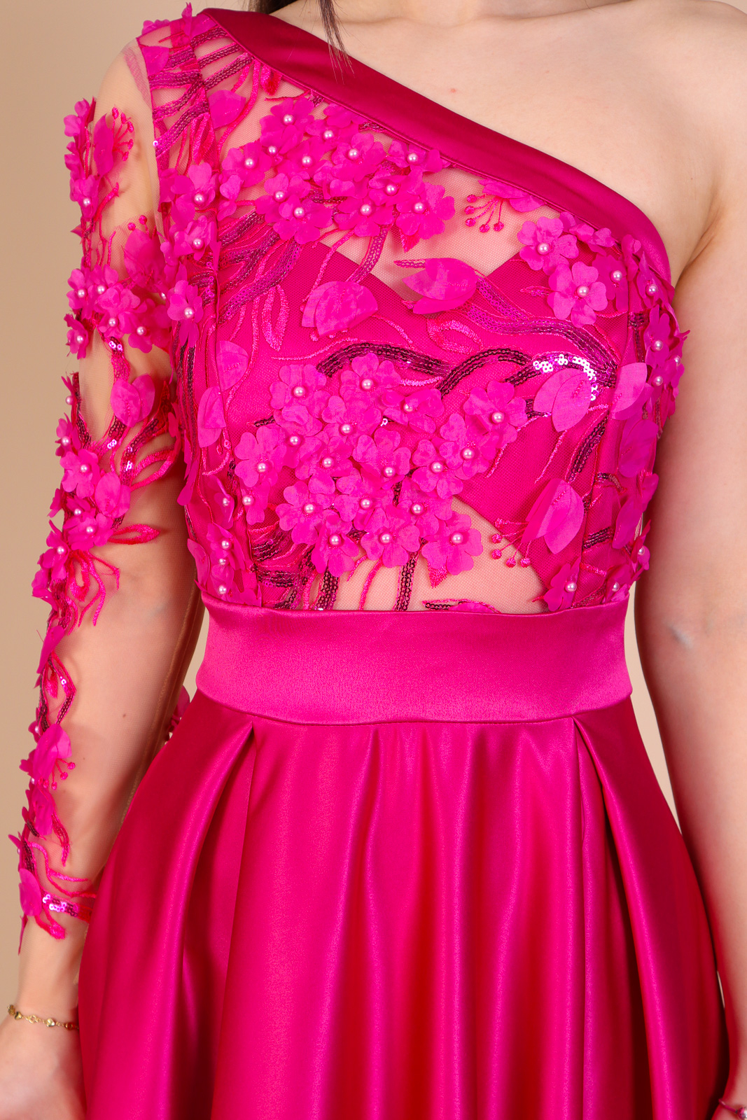 Rochie lunga eleganta din tafta, cu bust decorat cu dantela 3D, broderie si paiete. Are o maneca lunga,  buzunare functionale, crepeu frontal si croiala clos, care ofera lejeritate in miscare. Se inchide cu fermoar discret la spate. Compozitie: 90% Poliester, 10% Elastan