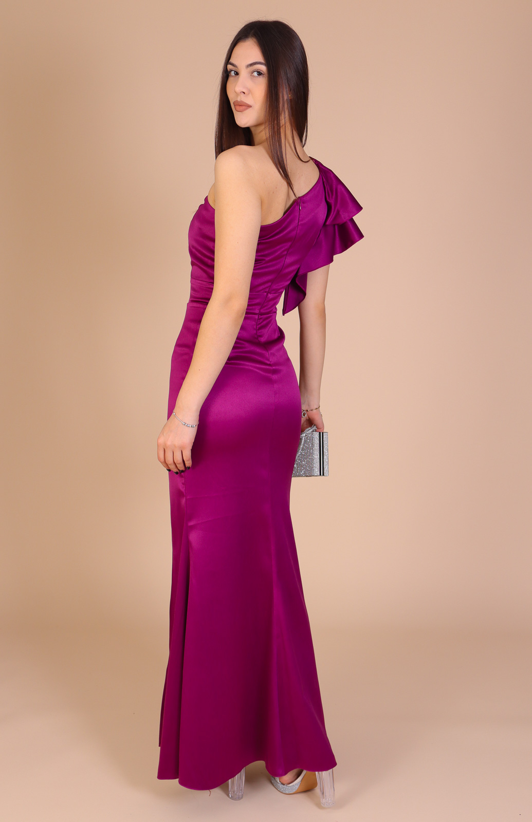 Rochie lungă de ocazie din tafta, cu design asimetric pe un umăr, volan elegant și accesoriu în talie. Se închide discret cu fermoar la spate.