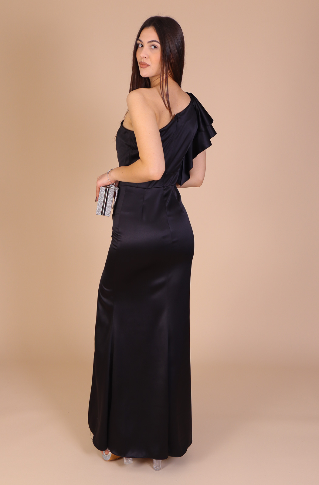 Rochie lunga de ocazie din tafta, cu design asimetric pe un umar, decorata cu un volan elegant si accesoriu in talie. Se inchide discret la spate cu fermoar ascuns. Compozitie: 90% Poliester, 10% Elastan.
