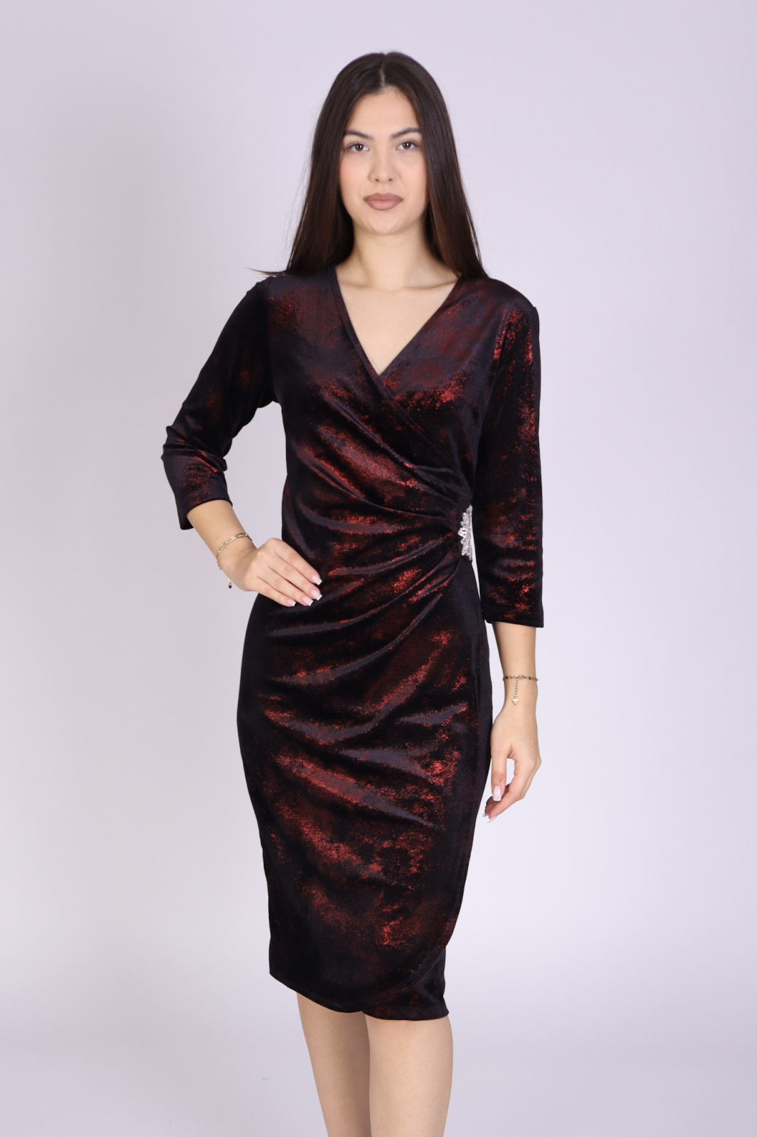 Rochie elegantă din catifea bordo, cu decolteu în V petrecut și mâneci trei sferturi. Accesoriul argintiu din talie adaugă un accent rafinat și evidențiază frumos silueta. Se închide cu fermoar la spate și este realizată din material confortabil, plăcut la purtare.
