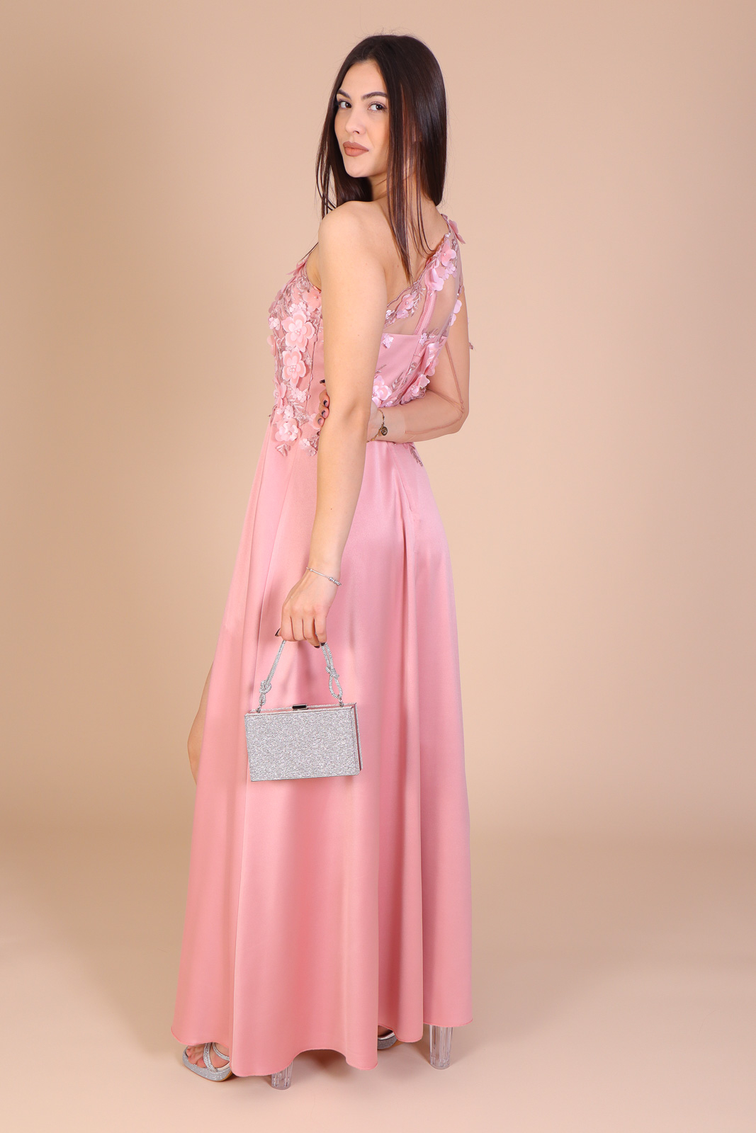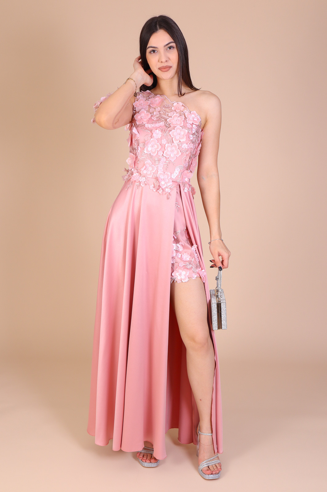 Rochie lungă de ocazie cu crepeu, bust din dantelă 3D, mânecă lungă din plasă și un umăr gol. Se închide cu fermoar la spate.