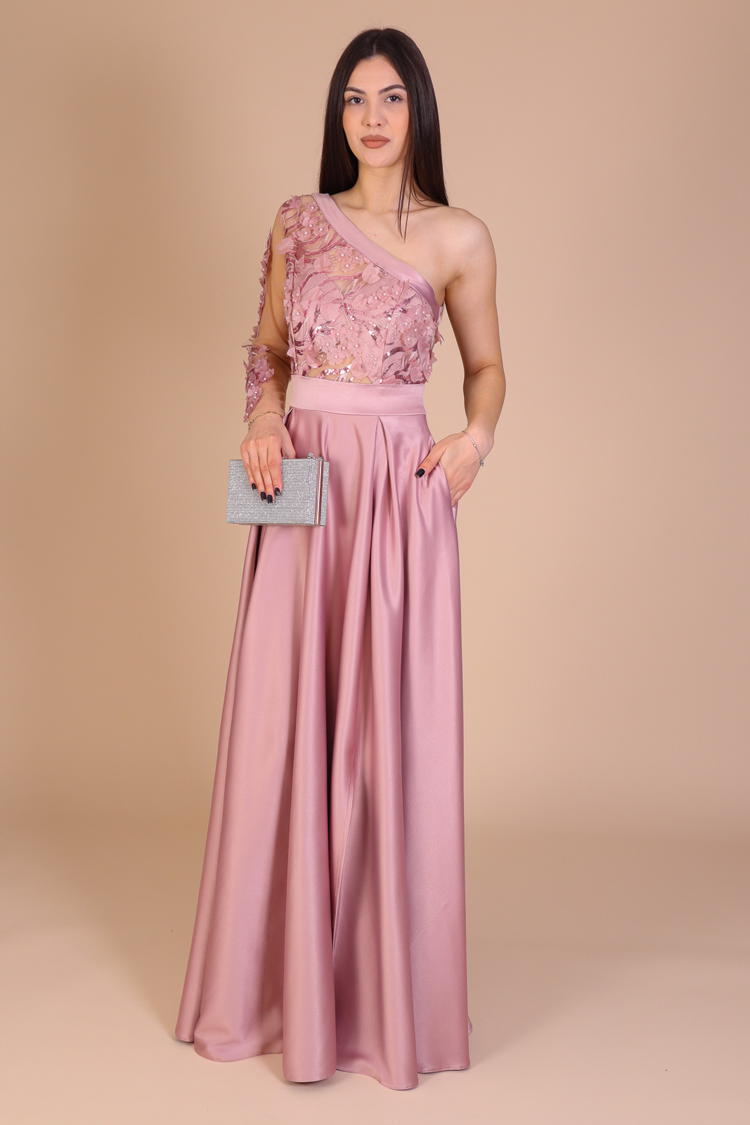 Rochie lunga eleganta din tafta, cu bust decorat cu dantela 3D, broderie si paiete. Are o maneca lunga,  buzunare functionale, crepeu frontal si croiala clos, care ofera lejeritate in miscare. Se inchide cu fermoar discret la spate. Compozitie: 90% Poliester, 10% Elastan